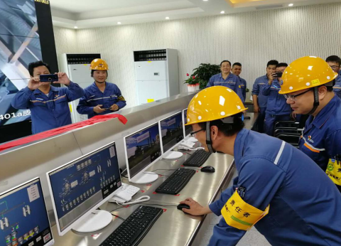 图2.项目组领导按下系统切换按键 在集控中心可以全面实时监控石灰作业区内的所有设备,进一步优化了人力资源,提高了工作效率,加强了生产管理,实现了一体化操作。通过集控,石灰作业区还实现了3#双膛窑投产后“增产不增人”的目标。