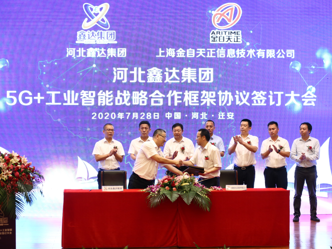2020年7月28日,公司总经理程长峰、市场副总监魏树军赴河北鑫达钢铁集团签署5G+工业智能战略合作框架协议。